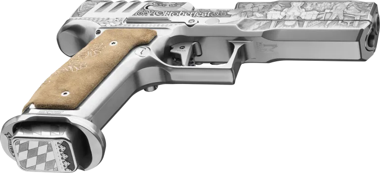 The Bavarian's entire surface is transformed through extensive, deep-relief hand engraving by master engravers at the world-famous Bottega Giovanelli in Italy. Every line, shadow, and flourish is meticulously carved by hand, depicting the joyous spirit of Oktoberfest in breathtaking detail: overflowing Maßkrüge of frothy beer, massive pretzels, lively Dirndl- and Lederhosen-wearing celebrants toasting "Prost!", traditional Bavarian architecture, alpine flowers like edelweiss, proud lions of Bavaria, rolling meadows, festive garlands, and intricate folk art patterns. These scenes flow seamlessly across the slide, frame, trigger guard, controls, and even magazine bases—creating a panoramic narrative of Gemütlichkeit and tradition.