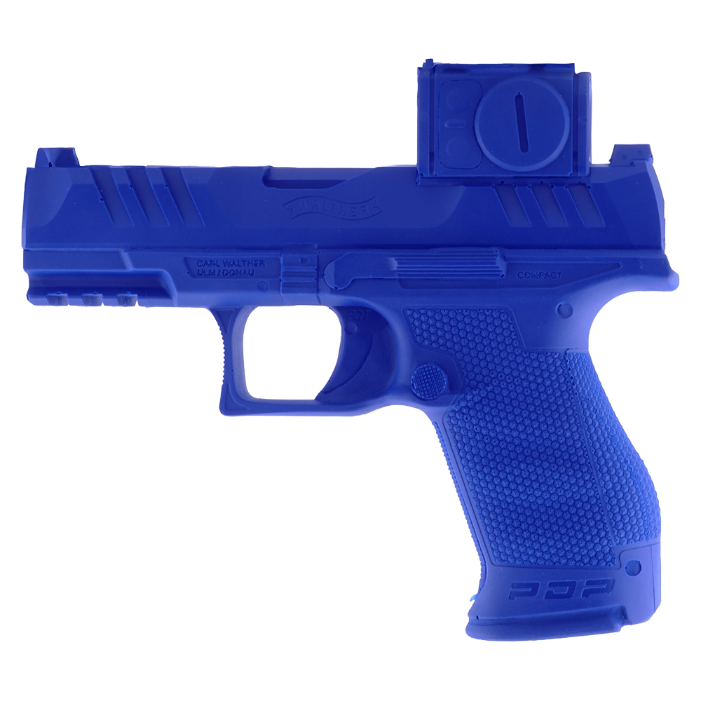 A Blue polymer replica of the PDP Compact in 4" w/Aimpoint ACRO, useful for both training and producing holsters.